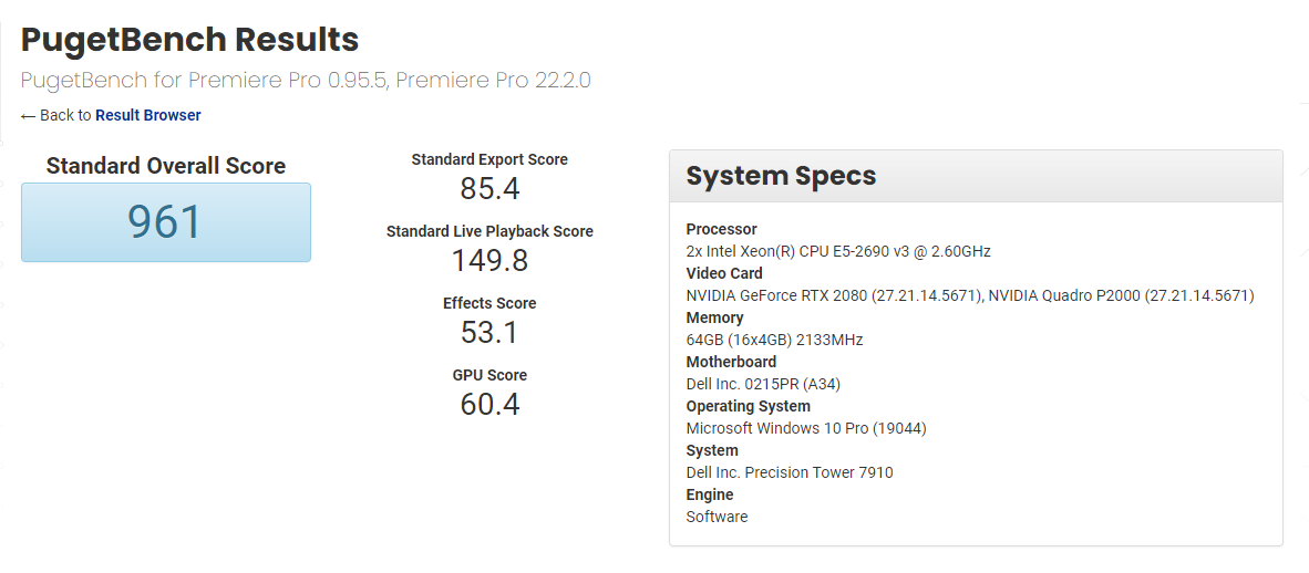 프리미어 프로 2022 에서 확인된 벤치 결과에서