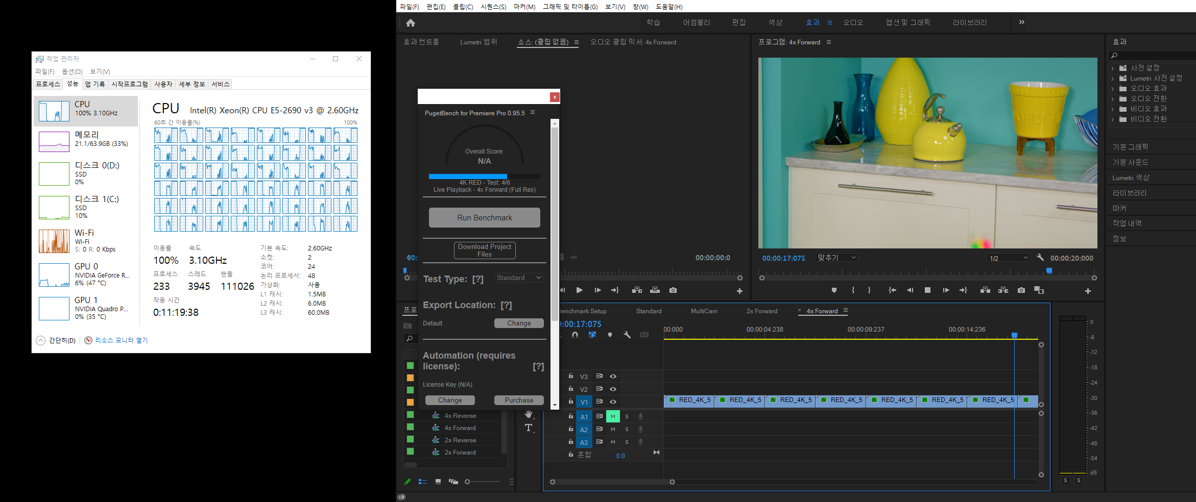 성능 확인을 위해서는 프리미어 프로를 직접 실행 가능해야 하며